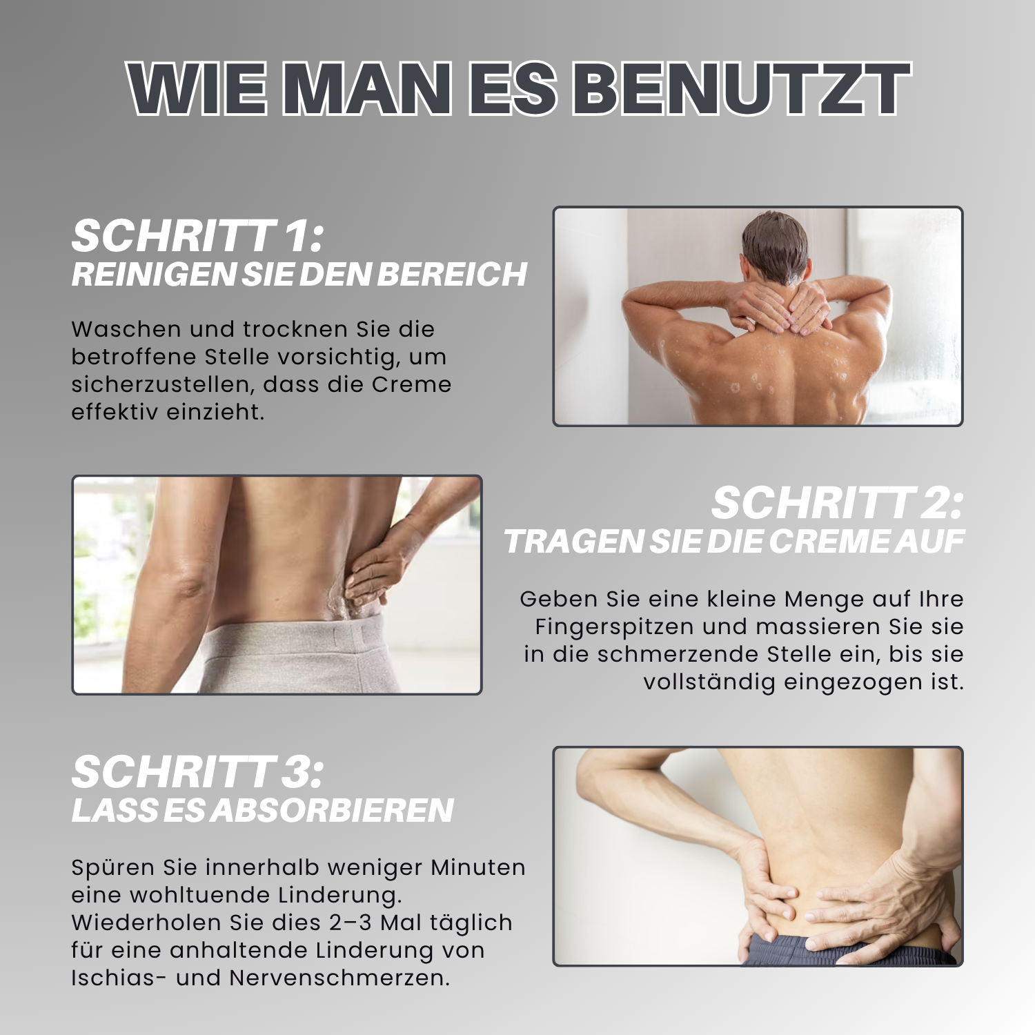 1️⃣ Lindert Schmerzen an der Quelle – Dringt tief in die Haut ein und beruhigt den entzündeten Ischiasnerv.
